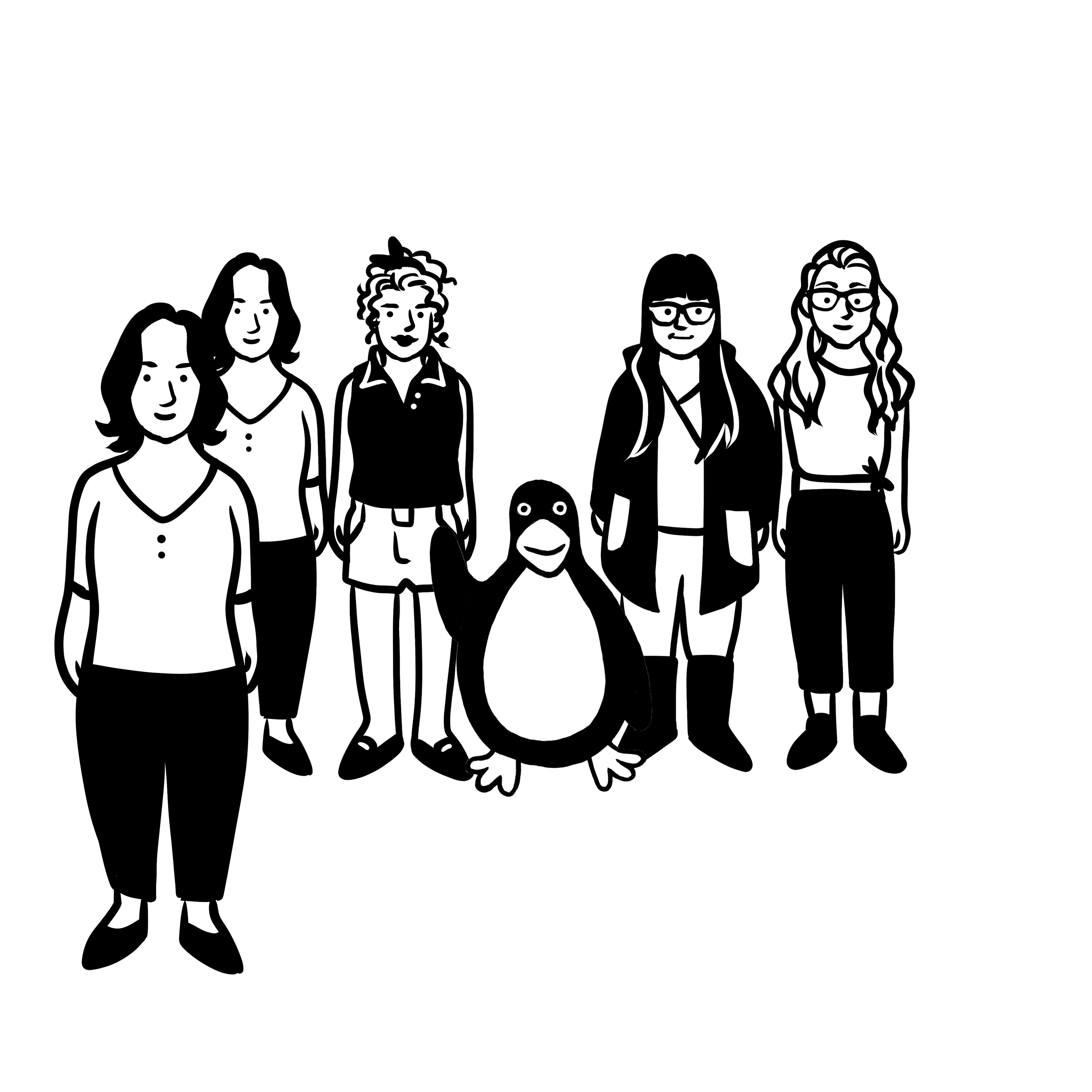 A black and white drawing of four people and a penguin standing in a line.