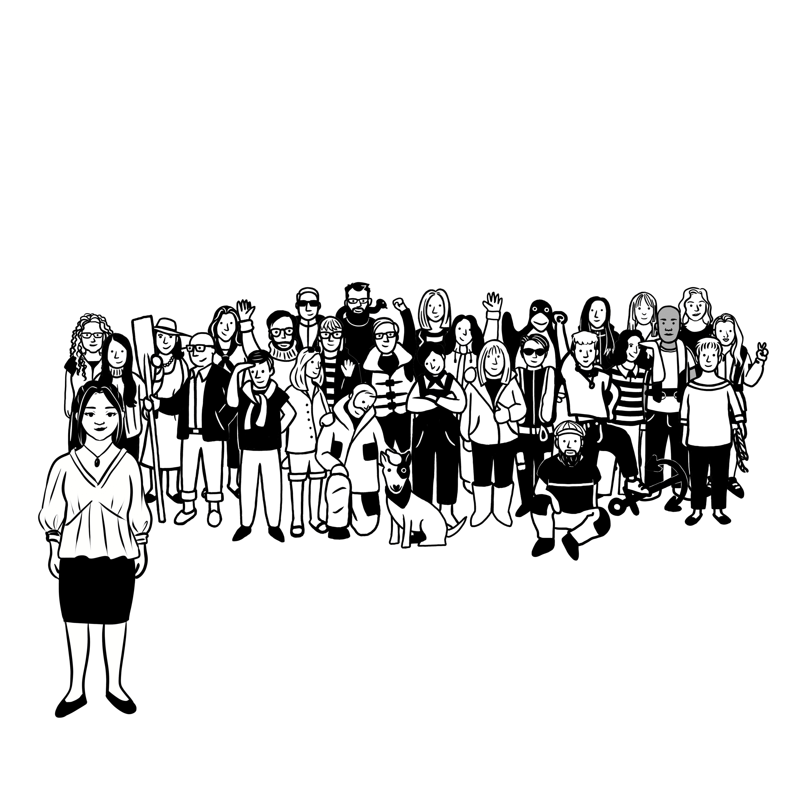 A woman stands in front of a large, diverse group of people and a dog against a white background. Profile