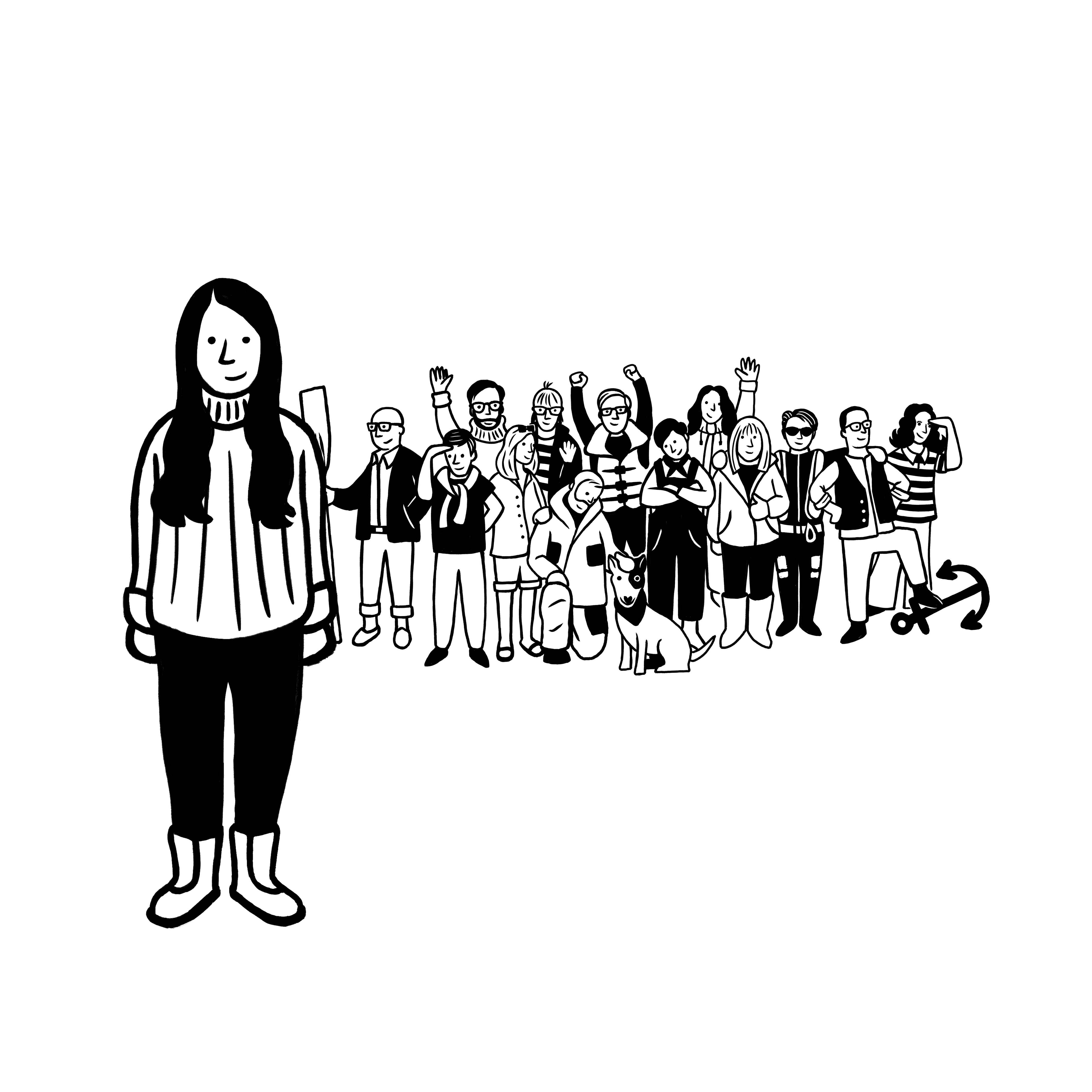 Drawing of a woman standing in the foreground, with a diverse group of people and a dog standing together in the background. Profile