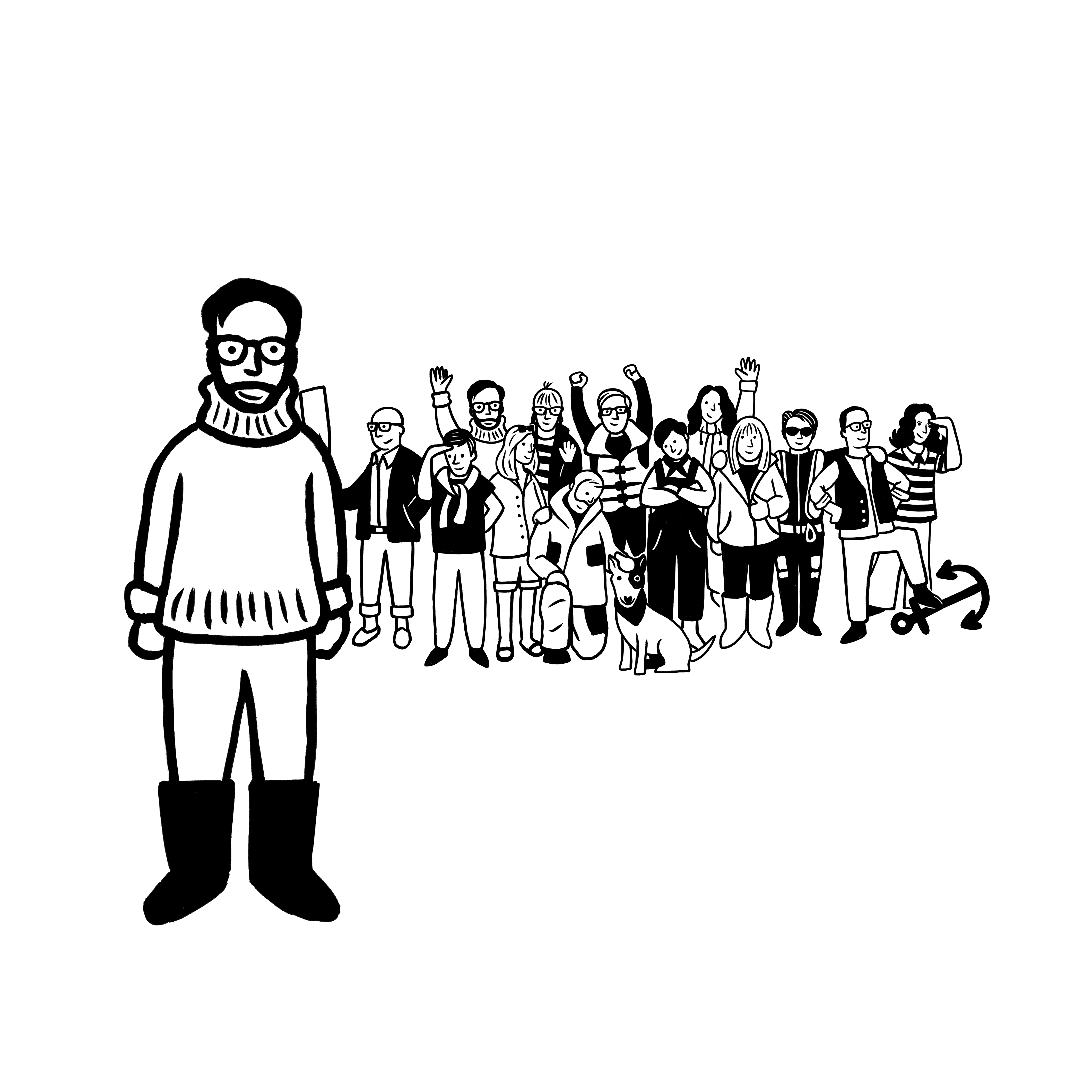 Illustration of a group of diverse people raising their hands in the background, with a person wearing glasses and a sweater standing in front. Profile
