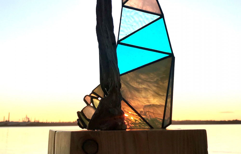 Jo said about creating the trophy: “I was really excited to be asked to make the trophy, as I love creating sculptural pieces using stained glass and driftwood. The brief was perfectly aligned with my style, including the use of salvaged materials. The finished piece is meant to evoke the feeling of the sea and yachting, with the end impression in the eye of the beholder; a spinnaker and main sail or a cresting wave with sea spray in the sea glass detail?”